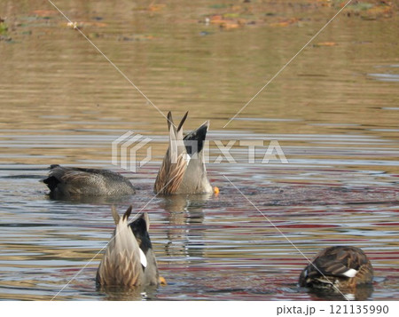 逆立ちして餌を採るカモの群れ