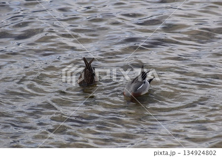 川に半身を突っ込み食べ物を探すオナガガモ