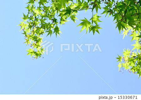 緑鮮やかなモミジの葉の透過光クローズアップと青空のコピースペース