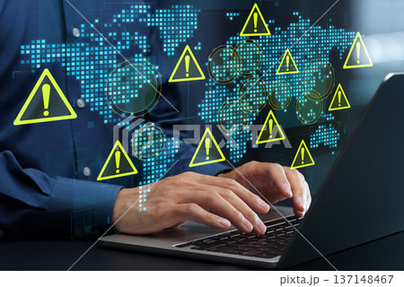 地政学的リスクの分析。グローバルビジネスのためのリスクマネジメント。世界地図と三角形の警告アイコン。