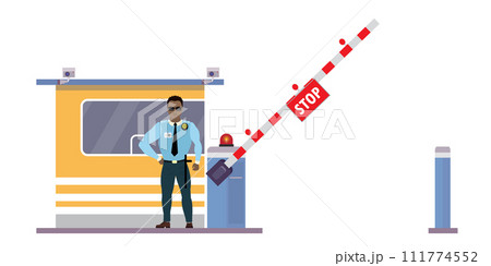 uniformed officer or protective agent near security cabin and gate with alarm,