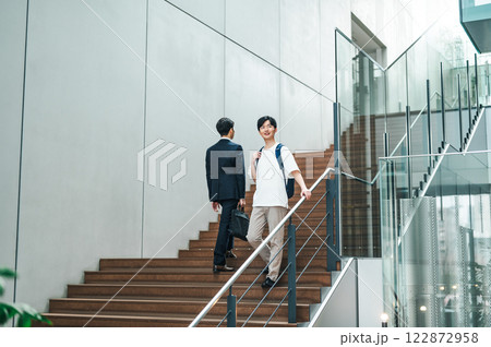 オフィスビルの階段を歩く若い男性