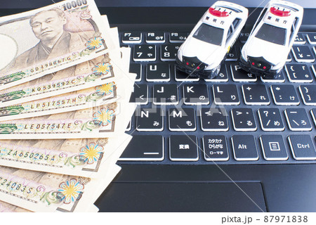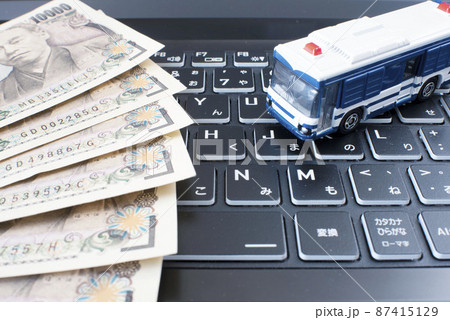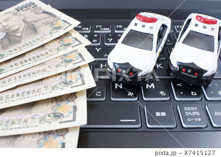 黒いノートパソコンのキーボードと1万円札と2台のパトカー