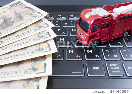 黒いキーボードと複数の1万円札と消防車とパトカー