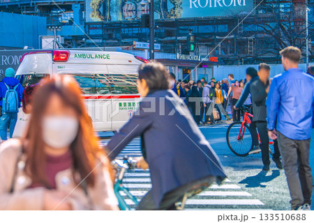 日本の東京都市景観減速した救急車…マイクで必至に…呼びかけるが、無視して交差点には日本人がゾロゾロ