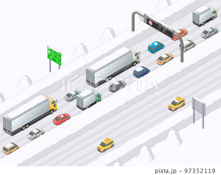 アイソメトリック図法で描いた渋滞中の高速道路のイメージ(雪道)