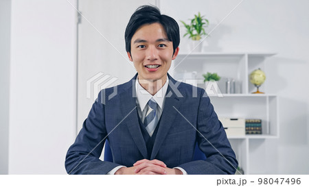 カメラ目線で話すビジネスマン ビデオ通話 インタビュー