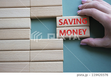 Saving Money symbol. Concept word Saving Money on wooden blocks. Businessman hand. Beautiful grey green background. Business and Saving Money concept. Copy space