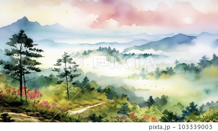 早朝の里山に朝焼けの中に朝靄が雲海のように広がっている。水彩画にした。