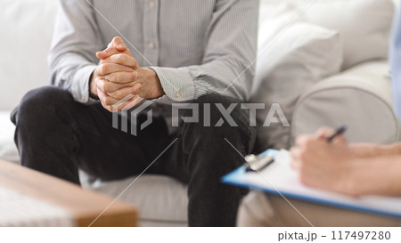 A man sits on a couch with his hands clasped, speaking with a therapist who takes notes on a clipboard during a session in a cozy living room setting, cropped