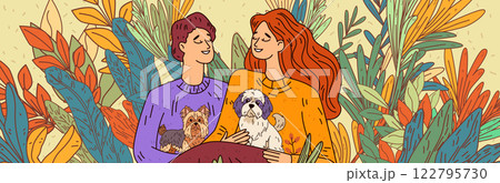 Couple with dogs surrounded by colorful foliage peaceful nature scene vibrant leaves cozy sweaters warm tones website banner