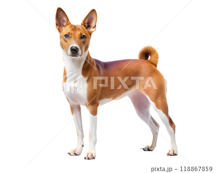 White-red cute Basenji dog standing and looking at camera, isolated on white background.