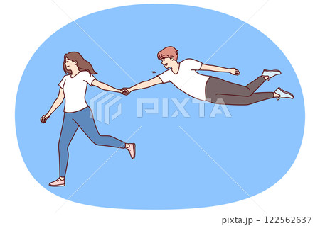 Woman says follow me and holds hand of flying man who wants to be always with girlfriend