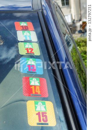 車のフロントガラスの隅に貼られた一年ごとの車検証