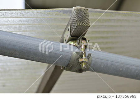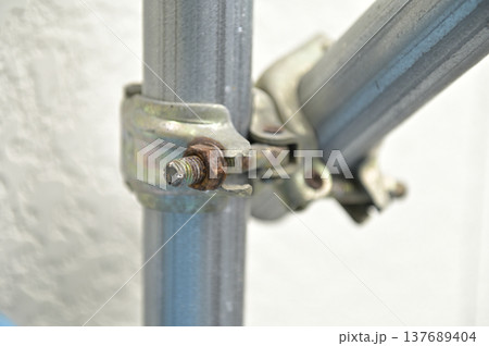 錆びたボルトで固定された工事現場の足場用金属クランプ(自在クランプ)