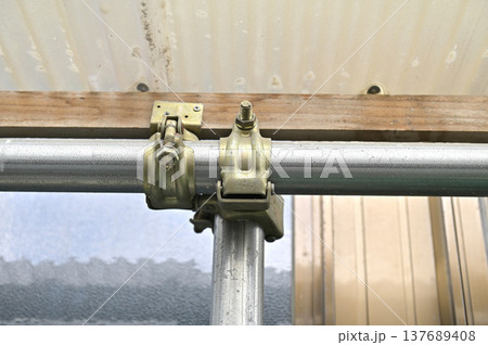 単管パイプを固定する直交クランプと錆びたボルト