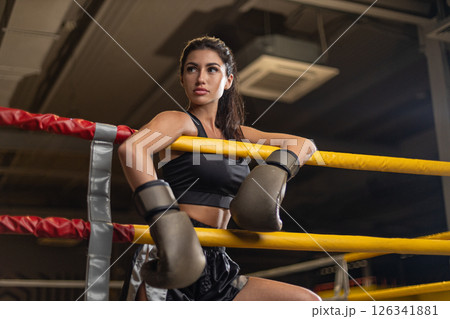 young female boxer leans against the ropes in a gym wearing boxing gloves and workout gear. Her focused expression reflects her dedication to training and the sport.
