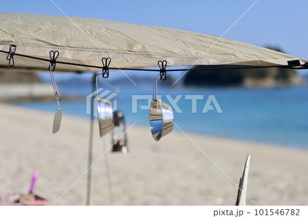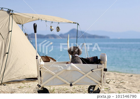トイプードルを連れて女子キャンプ 青い海・美しいビーチでのんびり島キャンプ キャンプ料理を楽しむ女性