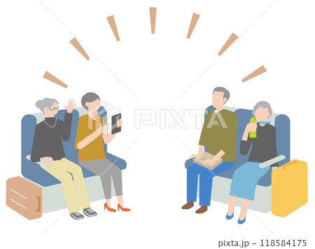 電車での旅行を楽しむシニアのグループのイラスト