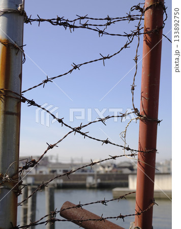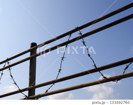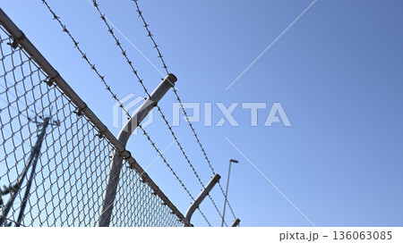 有刺鉄線が張られた厳重なセキュリティフェンス(立ち入り禁止・防犯・境界)