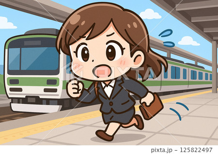 駅のホームで焦る女性キャラクターのイラスト(ミニキャラ風)