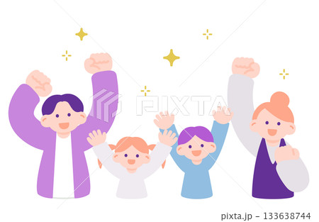 家族で喜びを分かち合うガッツポーズ・万歳のイラストセット
