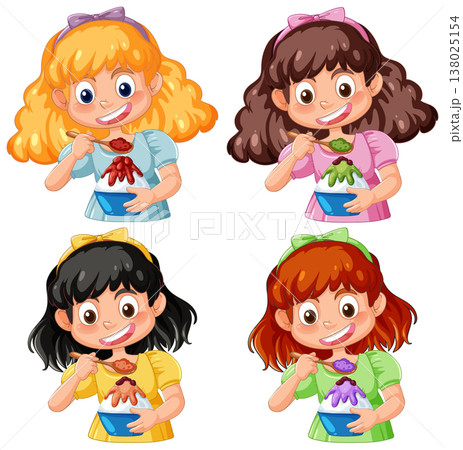 Four Cartoon Girls Eating Colorful Shaved Ice Desserts