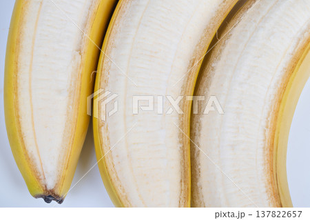 Ripe peeled bananas pair evoke playful tropical mood with curved forms and warm highlights, highkey composition suitable for summer campaigns, packaging, and editorial use