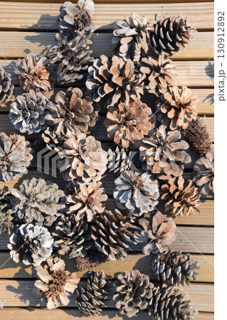 Many pine cones on table ウッドテーブルの上に並べられたたくさんの松ぼっくり