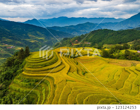 Aerial drone view of rice terrace field in the mist, northern of Vietnam