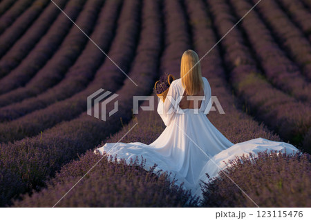 Lavender Provence Woman Dress: Sunset photoshoot; woman in white dress sits amidst purple lavender fields in Provence, France, showcasing serenity and beauty.