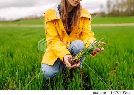 Farmer woman holding green wheat sprouts, checking growth. Scientist is checking the plant.