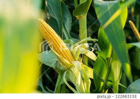 Corn cobs in corn plantation field. Beautiful organic corn field. A bright yellow cob of corn