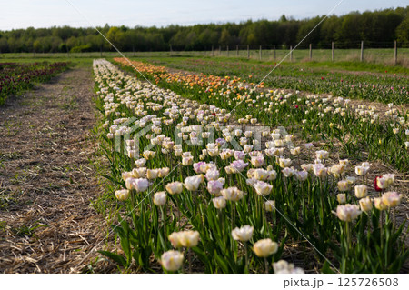 Vibrant rows of blooming tulips showcase a variety of colors in a tranquil field, reflecting the beauty of spring in Holland's countryside