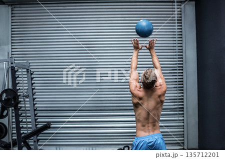 Shirtless man throwing blue medicine ball in gym near rack of weight plates, barbell on flooring