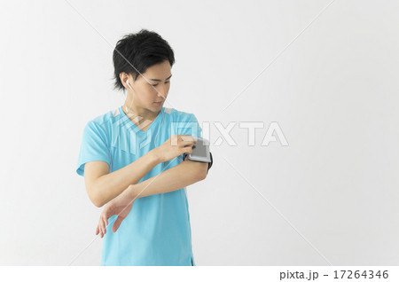 スマートウォッチ,万歩計,歩数計を使い健康管理・ヘルスケアをするスポーツウェア姿の中年男性