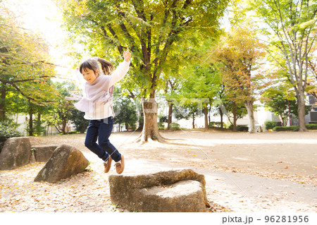 秋の公園で楽しくブランコを遊んでいる小学生の女の子の様子