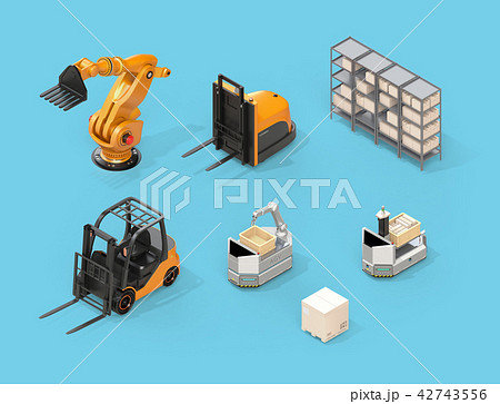 産業ロボット、AGV、フォークリフトのアイソメイメージ。工場自動化のコンセプト
