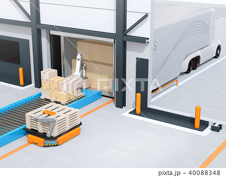 木製パレットを運ぶAGV自動搬送車、トラックの荷台から貨物をを降ろすロボットのイメージ