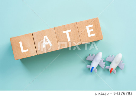 飛行機(フライト)の遅延、遅れ|「DELAY」と書かれた積み木と時計と飛行機のおもちゃ