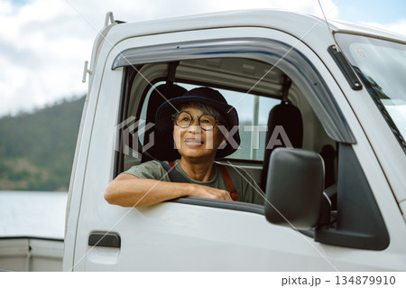 高齢女性と軽トラック 【撮影協力:隠岐シーサイドリゾートみやび様】