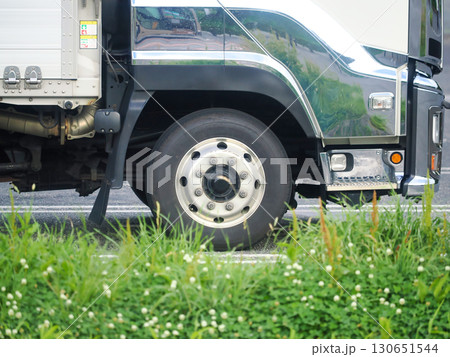 駐車場に停まる大型トラックの運転席側車輪