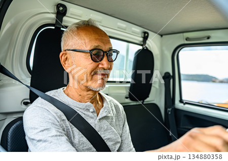 軽トラックに乗る高齢男性 【撮影協力:隠岐シーサイドリゾートみやび様】