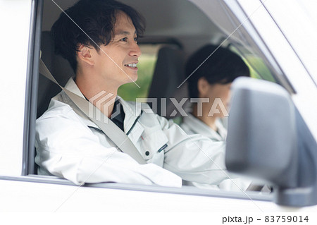 作業着を着てトラックを運転する若い男女