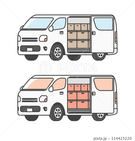 物流シリーズ:荷物を積み込んだ、配達へ出発する商用車バン、ワンボックスカー。(カラー&モノカラー)