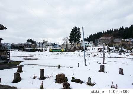 新潟県魚沼市の町並み 只見線の電車を眺める 魚沼田中近く 冬晴れの青空 田舎の散歩