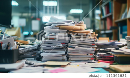 A cluttered office space showing an overwhelming amount of documents and paperwork piled on a desk.