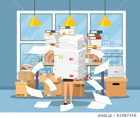 会社で事務仕事で忙しい働く女性ビジネスマン【人物ベクターイラスト素材】