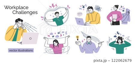Workplace wellness vector illustrations, work challenges and emotions set. Stress, productivity, teamwork, and mental health scenes. Flat cartoon characters for business and corporate themes