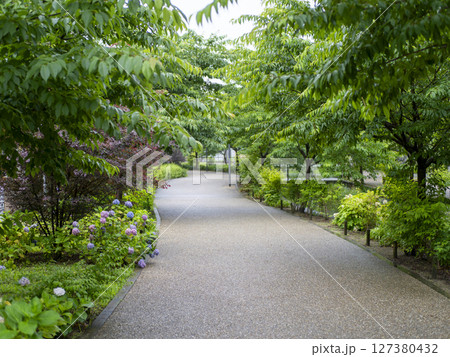新緑に覆われた公園の遊歩道